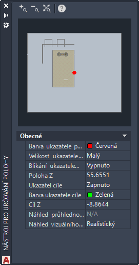 Ve výchozím nastavení se toto okno automaticky zobrazí během 3D průchodu nebo průletu. Změnou nastavení nebo přetažením indikátorů v tomto okně můžete změnit jejich bod pohledu ve výkresu.