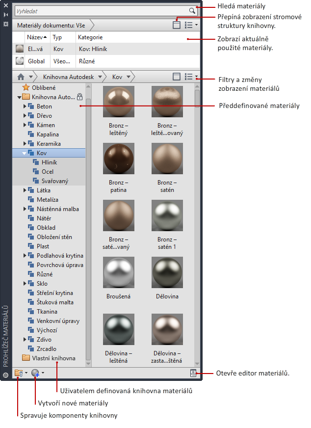 Součástí produktu je knihovna společnosti Autodesk s více než 700 materiály a 1 000 texturami. Materiály společnosti Autodesk můžete kopírovat do výkresu, upravit je a uložit do vlastní knihovny. Pro orientaci v materiálech společnosti Autodesk a uživatelsky definovaných materiálů a jejich správu použijte nástroj Prohlížeč materiálů.