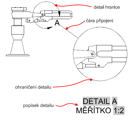 Detail dokumentace modelu je promítnutý pohled vytvořený z existujícího výkresového pohledu. V detailu je zobrazena určitá část výkresového pohledu ve zvětšeném měřítku.