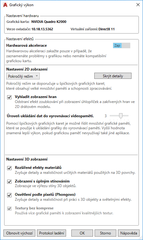 - Umožňuje použití hardwarové akcelerace a umožňuje řídit veškerá nastavení efektů dostupná pro aktuální ovladač. Pokud je vypnuta, je zapnuta pouze možnost Vyhladit zobrazení čar a režim se přepne na výchozí softwarový režim.