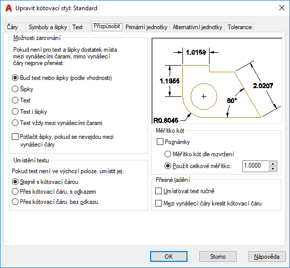Nastaví měřítko pro všechna nastavení kótovacího stylu, která určují velikost, vzdálenost nebo mezery včetně velikostí textu a šipek. Tohle měřítko neovlivňuje hodnotu změřených kótovacích hodnot. (Systémová proměnná DIMSCALE)