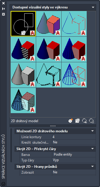 Správce vizuálních stylů má ve výkresu dostupný panel vzorových obrázků stylů zobrazení a následující panely vlastností: