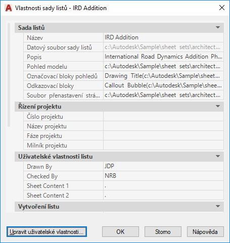Jedná se o informace, například cesta a název datového souboru sady listů (DST), cesty složek, které obsahují výkresové soubory asociované se sadou listů, a libovolné uživatelské vlastnosti asociované se sadou listů