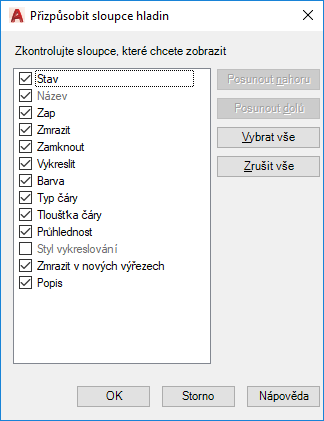 Určuje, které sloupce budou zobrazeny ve Správci vlastností hladiny pro aktuální kartu Model nebo kartu rozvržení.
