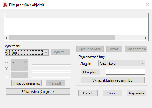 Umožňuje vybrat, upravit a pojmenovat filtry pro výběr objektů.