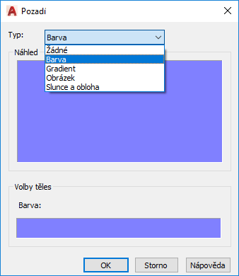 Zobrazuje seznam předefinování pozadí (Žádné, Barva, Gradient, Obrázek nebo Slunce a obloha), které je možno použít pro pojmenovaný pohled.