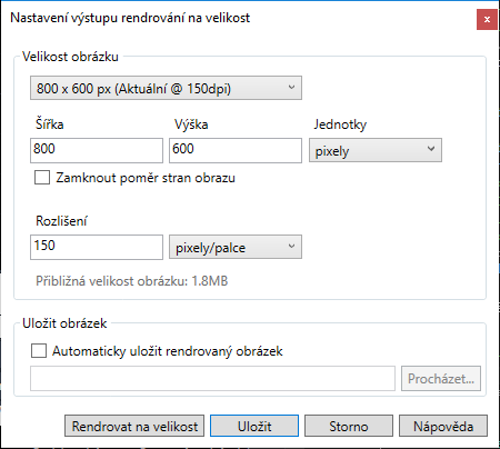 Nastaví velikost výstupu a rozlišení rendrovaného obrázku.