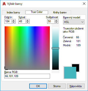 Určuje pro výběr barev barevný model RGB. Možnosti, které jsou dostupné na kartě True Color, jsou závislé na tom, zda je zadaný barevný model HSL nebo RGB.