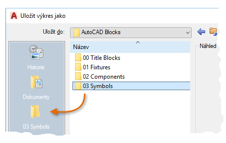 Tip: Jakmile uložíte výkres, přejděte do složky, klikněte pravým tlačítkem a vytvořte několik dalších složek k uspořádání výkresů bloků. Jeden nebo více bloků můžete přetáhnout na panel Místa, aby je bylo možné v budoucnosti snadno najít.