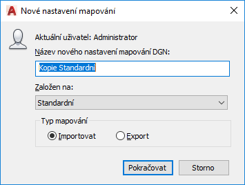 Otevírá dialog Úprava nastavení mapování DGN. V závislosti na vybraném typu mapování (Import nebo Export) se zobrazí odpovídající dialog pro import/export.