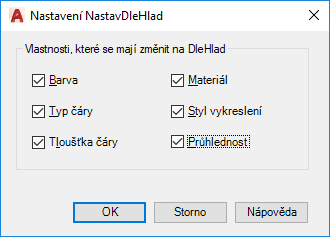 Změní přepsání vlastnosti u barvy, typu čáry, tloušťky čáry, materiálu, stylu vykreslování a průhlednosti na DleHlad u zvolených objektů a vložených bloků na odemknutých hladinách.