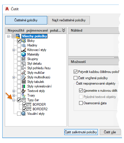 Při vyčištění všech neodkazovaných typů čar vyberte položku Typy čar.