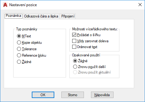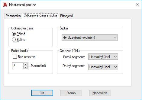 Nastavuje typ poznámky s odkazovou čárou. Vybraný typ změní výzvu příkazu RODKAZ při vytváření poznámky s odkazovou čárou.