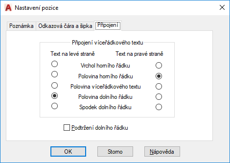 Nastaví místo připojení odstavcového textu poznámky k odkazové čáře. Tato karta je dostupná pouze tehdy, pokud je na kartě Poznámka vybrána možnost Mtext.