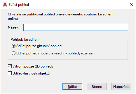 Publikuje reprezentaci aktuálního prostoru nebo celý výkres k prohlížení online a sdílení. Toto usnadní komunikaci a spolupráci s ostatními účastníky bez nutnosti sdílení zdrojových souborů DWG.