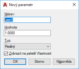 Slouží k vytvoření a definování nového uživatelského parametru pro přidání do tabulky vlastností bloku.