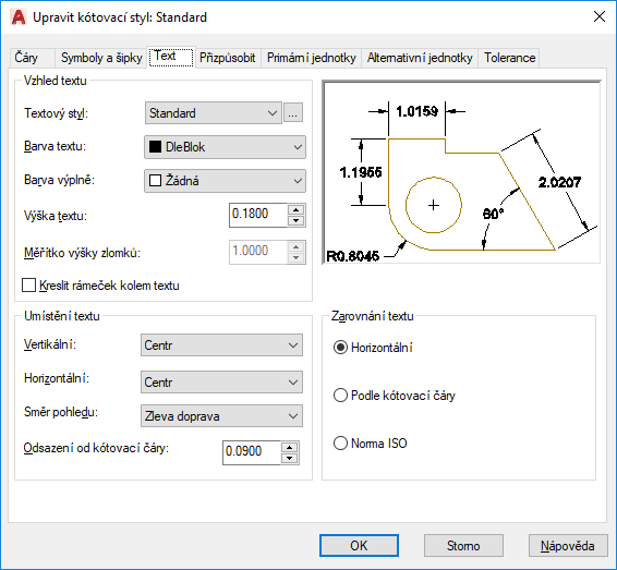 Pokud má styl textu zadaný na této kartě pevnou výšku textu, přepíše tato hodnota výšku textu zadanou zde. Pokud zde chcete nastavit výšku pro text kóty, ujistěte se, že výška stylu textu je nastavena na hodnotu 0. Informace o nastavení výšky textu u stylů textu najdete u příkazu PÍSMO.