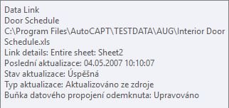 Je-li v aplikaci AutoCAD LT otevřen výkres obsahující tabulku extrakce dat, text nápovědy označuje, že tabulka obsahuje extrahovaná data. Nelze aktualizovat extrahovaná data nebo měnit datové spojení, existuje-li
