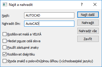 MTEXT (příkaz) Hledat: Vyberte ikonu Najít a nahradit v textovém editoru nebo v místní nabídce příkazu MTEXT.