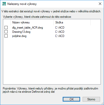 Zobrazuje seznam nových výkresů přidaných do složky, která byla vybrána k extrakci dat po ukončení extrakce.