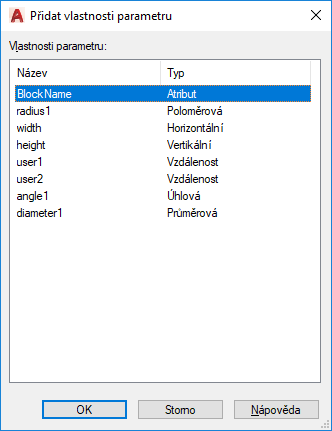Slouží k zobrazení názvů parametrů dostupných pro přidání do tabulky vlastností bloku.