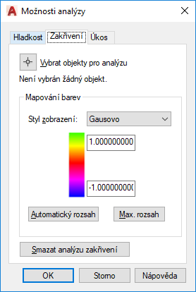 Vypočítá maximální a minimální rozsahy všech objektů vybraných k analýze zakřivení. (systémové proměnné VSACURVATUREHIGH a VSACURVATURELOW)