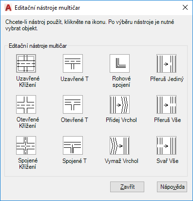 Dialog zobrazí nástroje s ukázkovými obrázky ve čtyřech sloupcích. První sloupec řídí multičáry, které se kříží, druhý multičáry, které tvoří T, třetí rohové spoje a vrcholy a čtvrtý zlomy multičar.