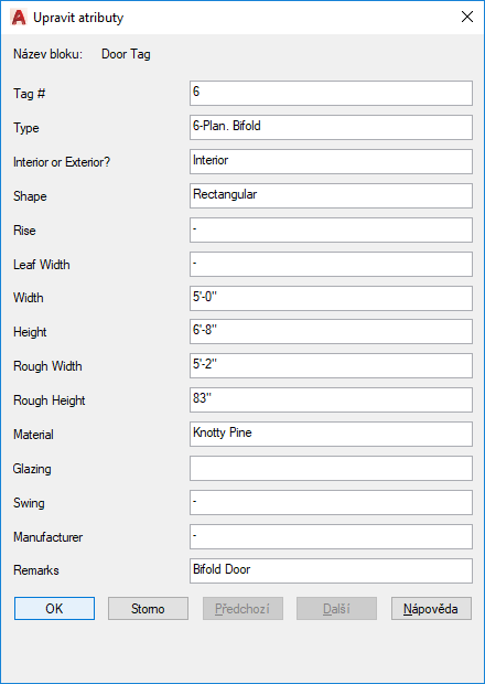 Tento dialog slouží ke změnám hodnot určitých atributů bloku. Chcete-li změnit vlastnosti atributu, jako je poloha, výška a styl, použijte příkaz -ATREDIT.