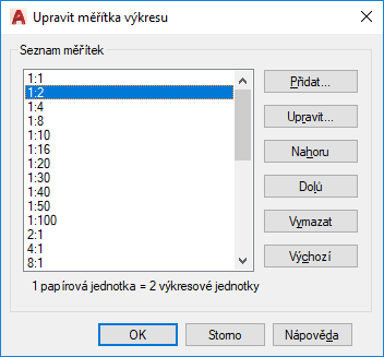 Zobrazí seznam aktuálně definovaných měřítek. Také zobrazí dočasná měřítka importovaná během připojování externích referencí. Je-li název měřítka zdvojený, ale má odlišnou hodnotu, bude k tomuto názvu připojeno číslo.