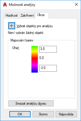 Změní nastavení zobrazení analýzy úkosu objektů těles a povrchů.