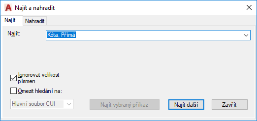 Vyhledává a nahrazuje příkazy nebo vlastnosti příkazů (názvy příkazů, popisy nebo makra). Pomocí karty Najít lze vyhledat zadaný textový řetězec a pomocí karty Nahradit lze zadaný textový řetězec vyhledat a nahradit.