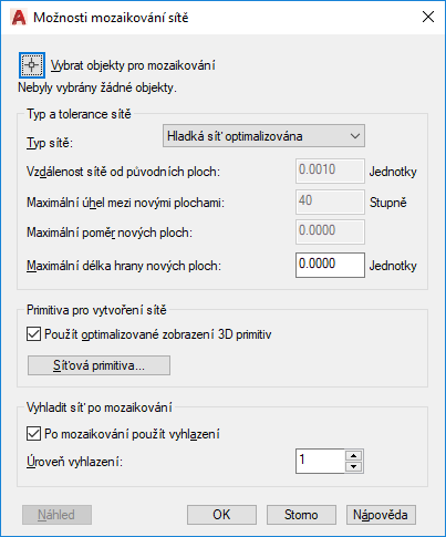 Výchozí nastavení určená v dialogu Možnosti mozaikování sítě řídí vzhled objektů převáděných na 3D objekty sítě. Úplný seznam objektů, které lze převést na síť, najdete v nápovědě k příkazu VYHLSÍŤ.