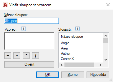 Zobrazí názvy sloupců z extrahovaných dat výkresu a externích dat (pokud bylo vytvořeno propojení). Názvy sloupců je možné dvojitým kliknutím přidat do pole Vzorec nebo přetáhnout ze seznamu Sloupec do pole Vzorec. Existující sloupce s názvy nejsou v seznamu uvedeny a nelze je použít jako hodnoty pro vytvoření dalších sloupců se vzorci.