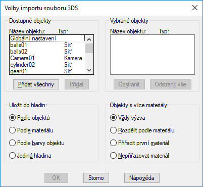 Vypíše seznam dostupných a vybraných 3D objektů, ukládá 3D objekty do hladin a pracuje s objekty s více materiály.