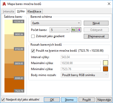 Upraví nastavení barevného schématu pro styly Výška u mračen bodů.