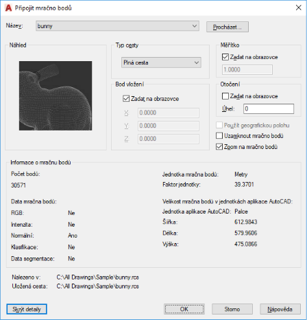 Připojení souboru projektu nebo snímku mračna bodů k výkresu, aby bylo možné s ním pracovat