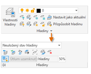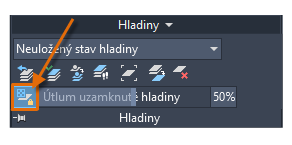 Funkce utlumení pro uzamknuté hladiny umožňuje snížit vizuální složitost výkresu při zachování vizuální reference a možností uchopení objektů.
