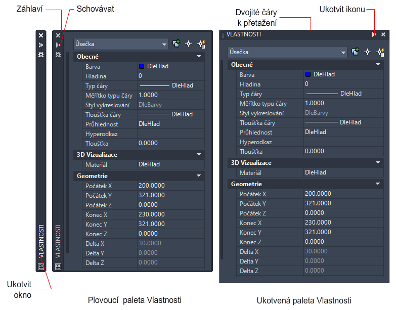 Okna, například pás karet, paletu Vlastnosti, palety nástrojů, okno Příkaz a okno DesignCenter, lze dokovat, ukotvit nebo nastavit jako plovoucí. Nastavení těchto a dalších možností je často možné změnit v místní nabídce, která je dostupná po kliknutí pravým tlačítkem myši na záhlaví palety nebo okna.