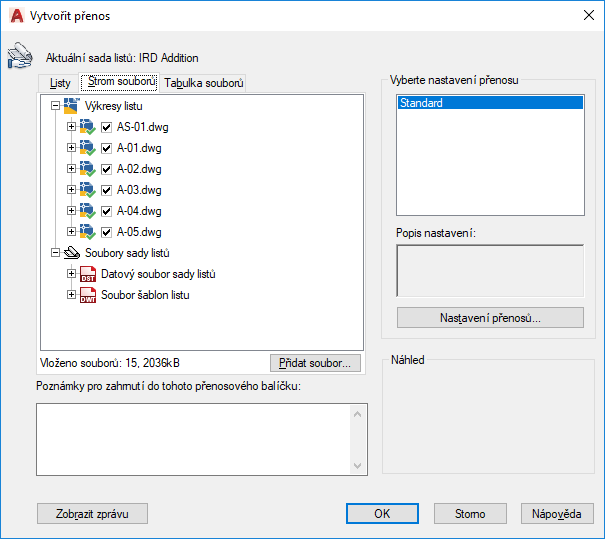 Implicitně jsou všechny soubory spojené s aktuálním výkresem (jako jsou externí reference, styly vykreslování a písma) uvedeny v seznamu. Do přenosu můžete přidat soubory nebo existující odstranit. Soubory, které jsou odkazovány prostřednictvím URL, nejsou do přenosu zahrnuty.