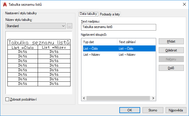 Když je tato volba zapnuta, zobrazí názvy pod-sad a rozdělí tabulku seznamu listů na části.