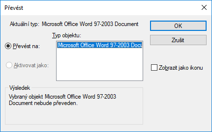 Otevře vložený objekt jako typ vybraný v poli Typ objektu a po editaci objekt vrátí na původní typ.