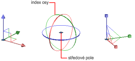 - Manipulátor 3D rotace. Slouží k otáčení vybraných objektů kolem zadané osy.