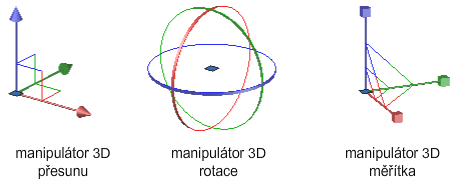 - Manipulátor 3D přesunu. Slouží ke změně umístění vybraných objektů podél osy nebo roviny.