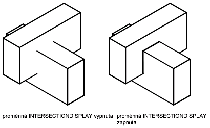 Systémová proměnná INTERSECTIONDISPLAY umožňuje řídit zobrazení průsečíků 3D těles a povrchů, když je vizuální styl nastaven na 2D drátový model.
