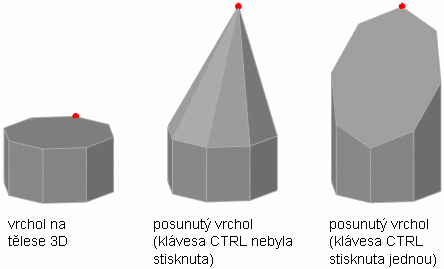 Tvar 3D tělesa nebo povrchu lze změnit úpravou jednoho nebo více vrcholů. Použijte uzly a manipulátory nebo spusťte příkaz 3DPOSUN, 3DOTOČ nebo 3DMĚŘÍTKO. Při změně měřítka nebo otáčení vrcholů je třeba vybrat dva nebo více vrcholů, aby se v objektu změna projevila. Kliknutím a přetažením vrcholu se 3D objekt roztáhne.
