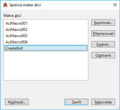 Soubory zaznamenaného makra akce (ACTM) jsou uvedeny v dialogu Správce maker akcí.