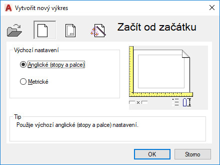 Možnost Začít od začátku vytvoří nový výkres s použitím standardního nastavení anglického nebo metrického systému jednotek. Možnost Použít šablonu vytvoří nový výkres s použitím nastavení definovaného pro výkresovou šablonu, kterou vyberete. Možnost Použít průvodce vytvoří nový výkres s použitím nastavení, které určíte buď pomocí rychlého nebo rozšířeného nastavení. (První možnost, Otevřít výkres, není k dispozici v rámci příkazu NOVÝ. Pro otevření existujícího výkresu použijte příkaz OTEVŘI.)