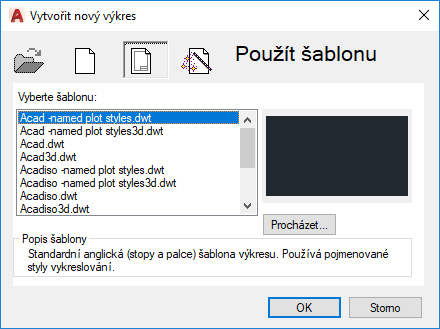 Obsahuje seznam všech DWT souborů, které jsou momentálně k dispozici v souboru výkresových šablon, který je určen v dialogu Možnosti. Vyberte soubor, který použijete jako počáteční bod pro nový výkres.