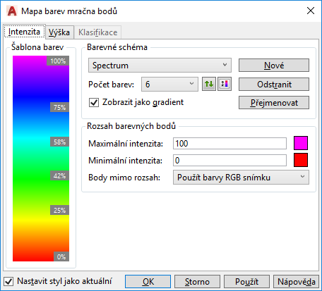 Upraví nastavení barevného schématu pro styly intenzity mračna bodů.