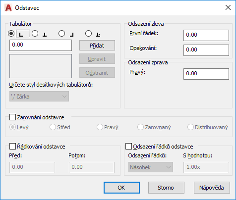 Zobrazí volby tabulátoru včetně možností přidávání a odstranění. Možné tabulátory jsou levý, střed, pravý a desetinný. Tabulátory lze také nastavit tlačítkem Výběr tabulátoru na pravítku Editoru na místě.
